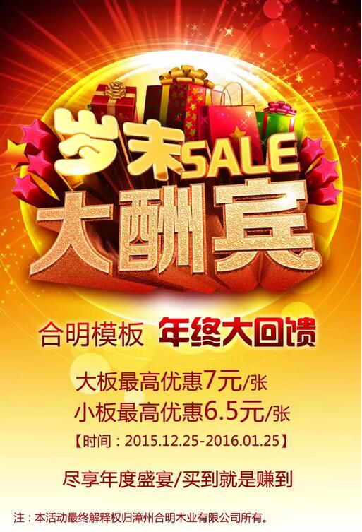 合明快訊 合明舉行年終大回饋,活動火爆進(jìn)行中,浙江、江蘇、福建、廣東、江西、四川、陜西等地的客戶紛紛下單,表示現(xiàn)在購買很劃算,多個經(jīng)銷商還表示要趁現(xiàn)在優(yōu)惠多囤貨。活動不到2天已預(yù)定近13萬張建筑模板。