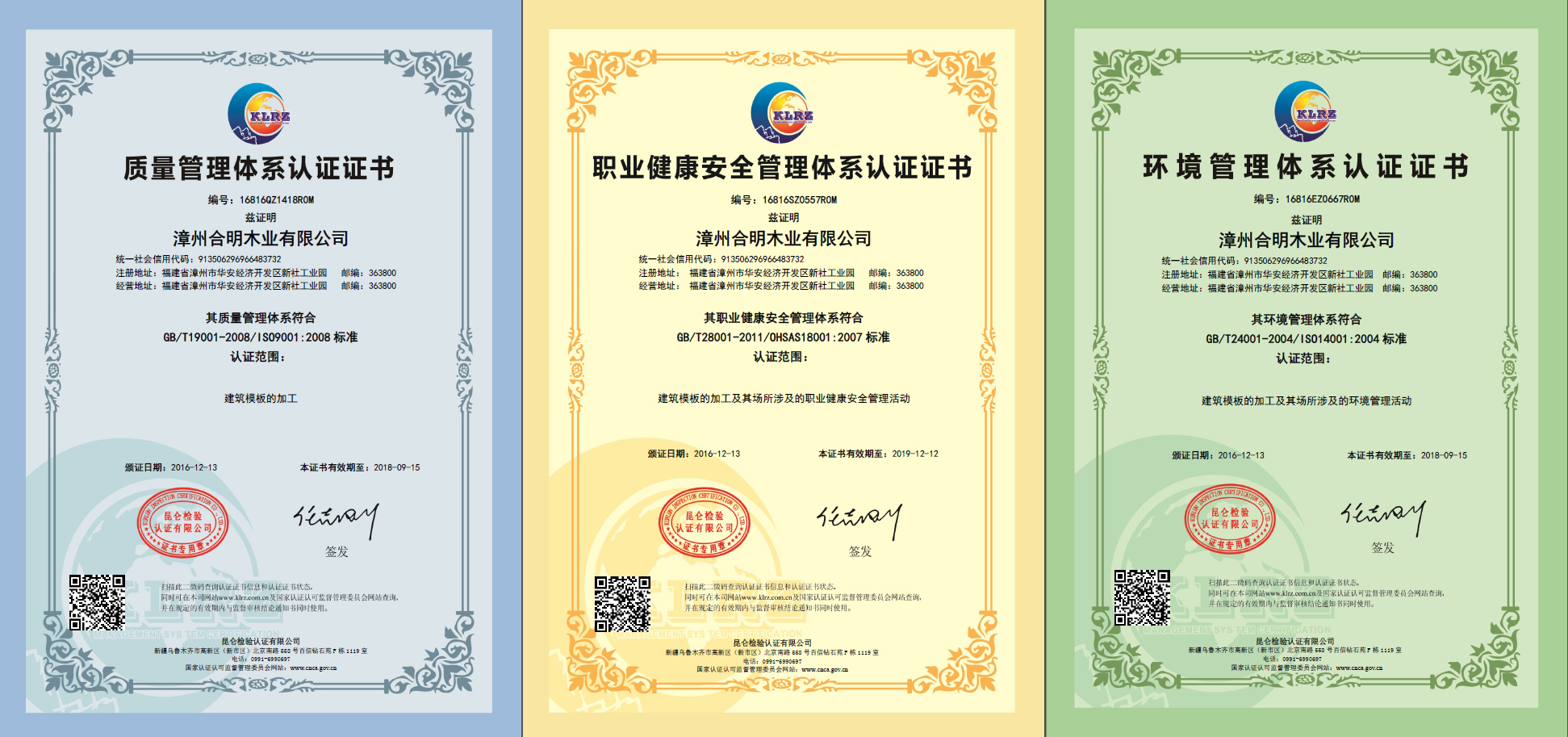 同時,作為年度收官,合明模板爆發力十足,一舉獲得“福建省著名商標”、并通過“環境管理體系”、“質量管理體系”、“職業健康安全管理體系”三大國際體系認證,再次官方鑒定,合明模板在福建膠合板行業的領先地位!