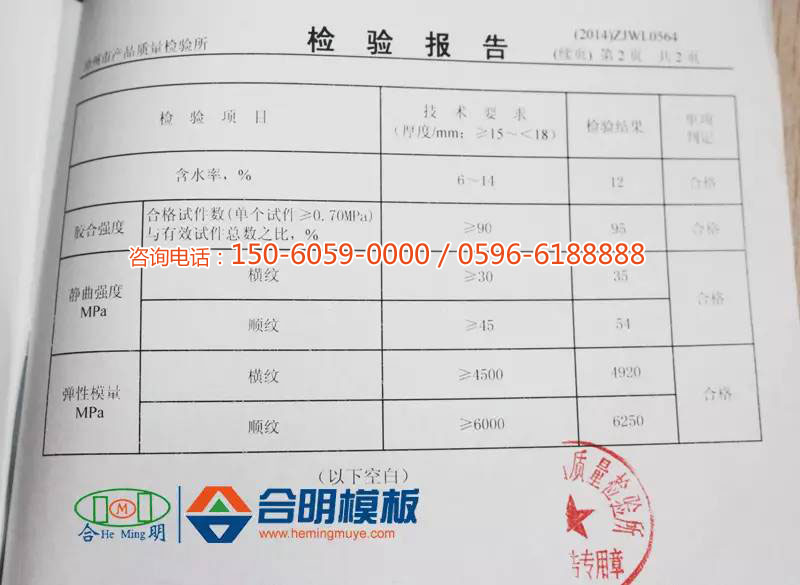經漳州市產品質量檢驗所抽樣檢驗,合明模板含水率適中,在檢驗標準范圍內,膠合強度、靜曲強度、彈性模量等檢驗數值均在標準之上,合明模板產品質量在合格模板產品標準之上。