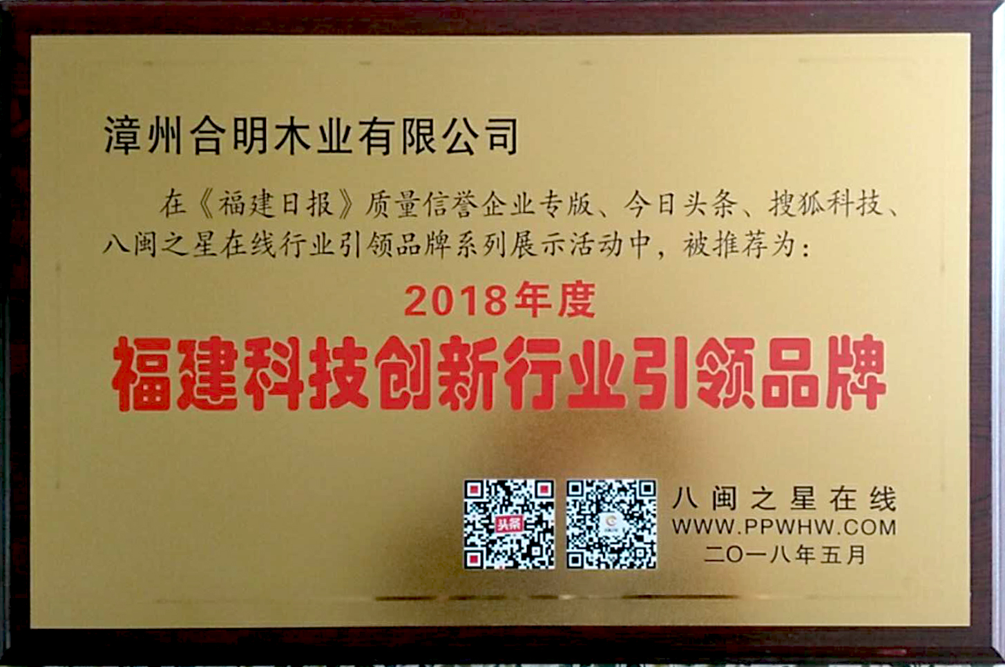 好消息!本月漳州合明木業有限公司在《福建日報》質量信譽企業專版、今日頭條、搜狐科技、八閩之星在線行業引領品牌系列展示活動中,被評為2018年度福建科技創新行業引領品牌。
