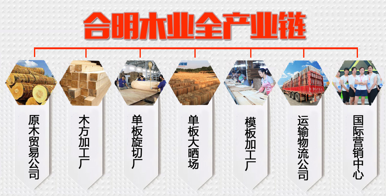 合明木業集產供銷為一體,除了模板生產外,旗下還有營銷中心、國際事業部、物流園、原木貿易公司、原木旋切廠、曬板場、方木加工廠等建筑模板生產附屬機構,踏實穩步經營,形成從原材料采購到建筑模板、建筑方木生產、出售全產業鏈大型企業。