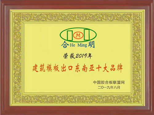 由于出口東南亞數額大、客戶好評率高,合明模板被授予了“2019年建筑模板出口東南亞十大品牌”榮譽稱號,這說明了合明模板良好的品牌形象,卓越的產品品質,以及強大的公司實力。