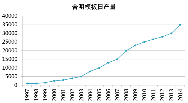 “合明牌”注冊成功,合明牌建筑模板開始推向市場。模板日產量平均達5000張。