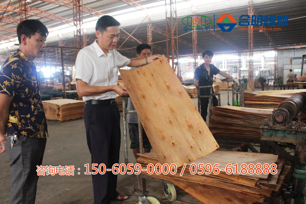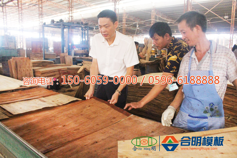 合明模板的排板工藝采用紅外線流水線和人工排板相結合,上下層進口一級面板+芯板縱錯排列排板而成。合明模板排板強調”密實度、平整度、膠合度、堅硬度、光滑度“五度管控法,林廠長每天必到各條流水線,抽檢抽查,如合明建筑模板售后出現問題,責任追究到當天排板個人。