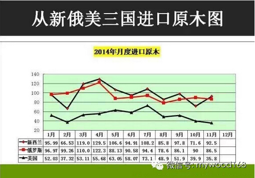 我國進口原木的三大來源國為新西蘭、俄羅斯和美國。2014年這些原木的進口量如何,他們的逐月進口走勢圖和對比誰強誰弱?