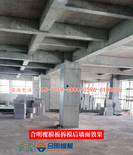 合明覆膜板表層膜厚實(shí)牢固,脫模不會對建筑物造成污染,且可以限制有害氣體的釋放量。覆膜板脫模后墻體平整光滑,可免于二次抹灰,大大縮短工期。