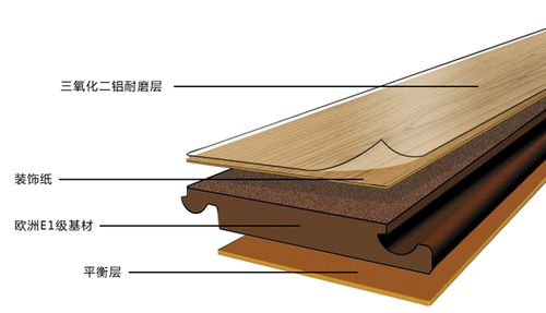 強(qiáng)化地板也稱浸漬紙層壓木質(zhì)地板/強(qiáng)化木地板,其由耐磨層、裝飾層、高密度基材層、平衡(防潮)層組成。浸漬紙層壓木質(zhì)地板是以一層或多層專用紙浸漬熱固性氨基樹脂,鋪裝在刨花板、高密度纖維板等人造板基材表層,背面加平衡層,正面加耐磨層,經(jīng)熱壓、成型的地板。