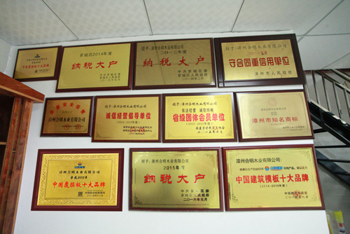 合明木業規模宏大,銷量領居漳州首位,連續三年被評為納稅大戶。公司也因規范管理及誠信經營被評為“誠信經營倡導單位”、“質量安全信譽單位”、“最佳誠信合作單位”等。合明品牌模板則憑借長期的質量保證通過ISO9001質量管理體系認證,并獲得“中國著名品牌”、“中國建筑模板十大品牌”、“中國覆膜板十大品牌”、“知名商標”等榮譽稱號。